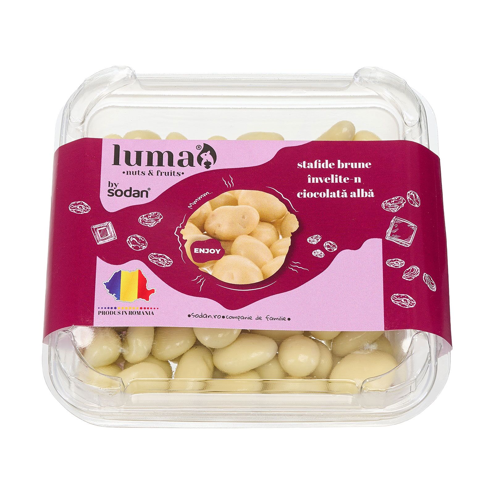 Stafidele brune învelite în ciocolată albă Luma îmbină perfect dulceața naturală a fructelor uscate cu finețea cremoasă a ciocolatei. Fiecare bob este atent ales, suculent și parfumat, acoperit uniform cu un strat generos de ciocolată albă care se topește în gură. Rezultatul – o gustare delicioasă, elegantă și plină de energie.